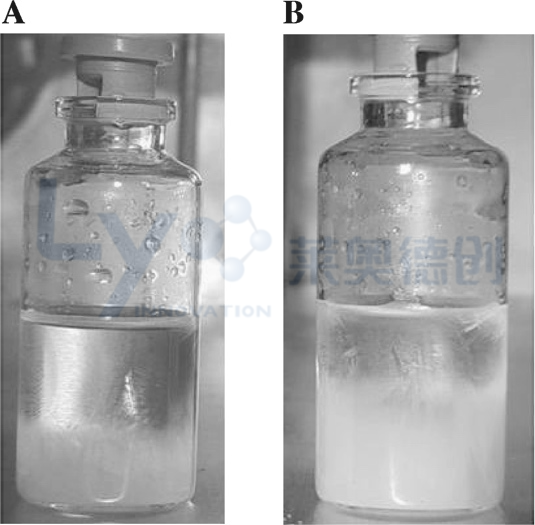 图3:单步冷冻工艺的SBECD+5%TBA的冷冻行为照片A:冰晶脱离并浮起;照片B:快速自上而下冻结