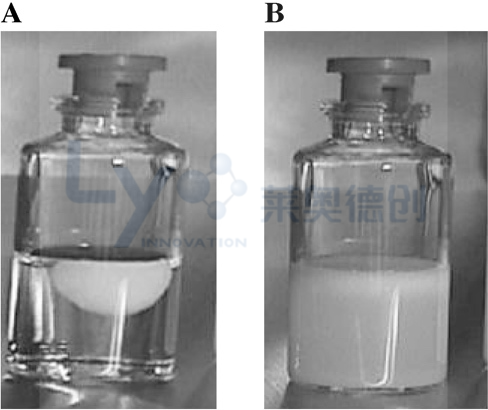 在两步冷冻过程中,由于小瓶中的配方首先被冷却至-10°C(高于冰核温度)并达到平衡,因此产品在整个溶液中保持过冷状态。当搁板温度快速下降时,发生快速冻结(图2A),在整个溶液中形成相对均匀的冰(图2B)。